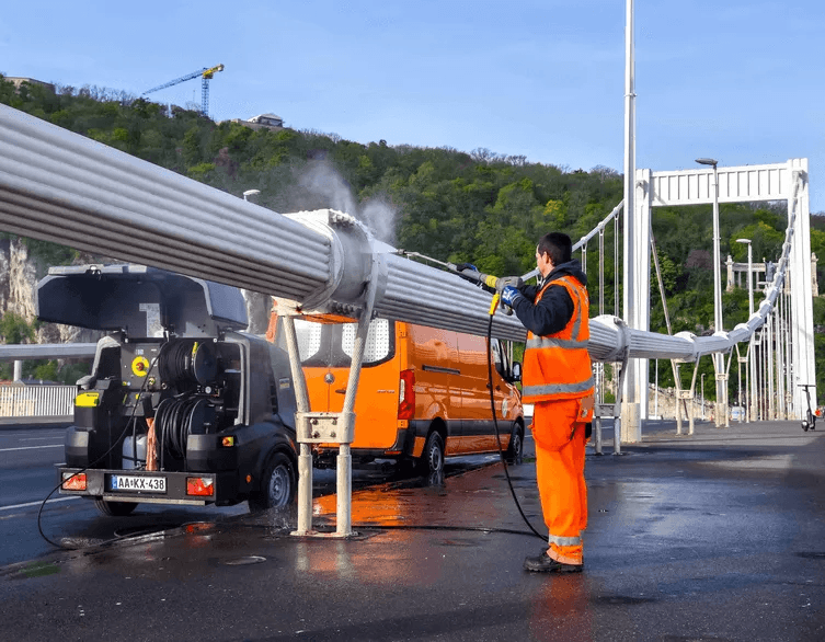 A dolgozók környezetkímélő tisztítószerrel és magasnyomású vizes eljárással mosják meg a hidat: